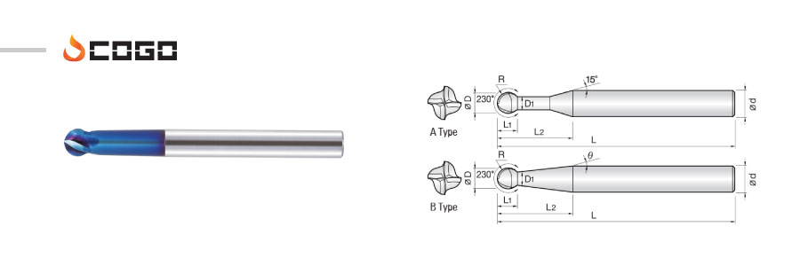 - - 230°degree ball shape for wide range 3D machining.