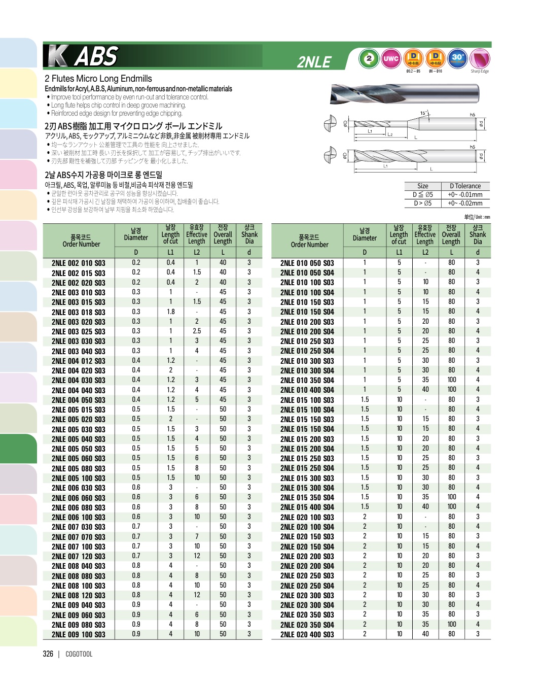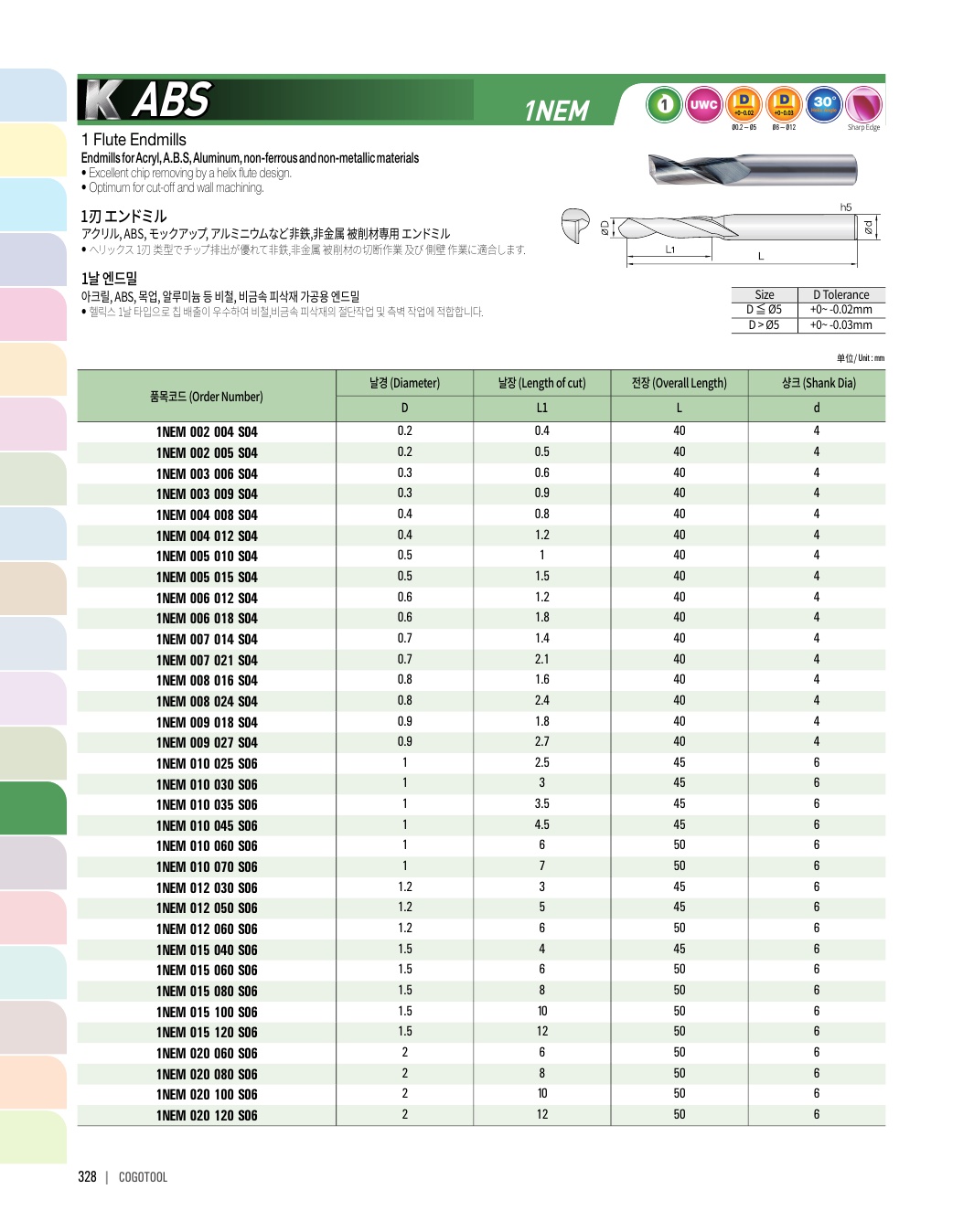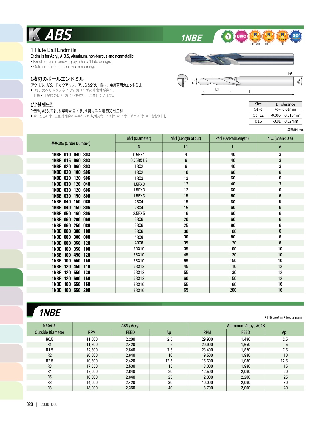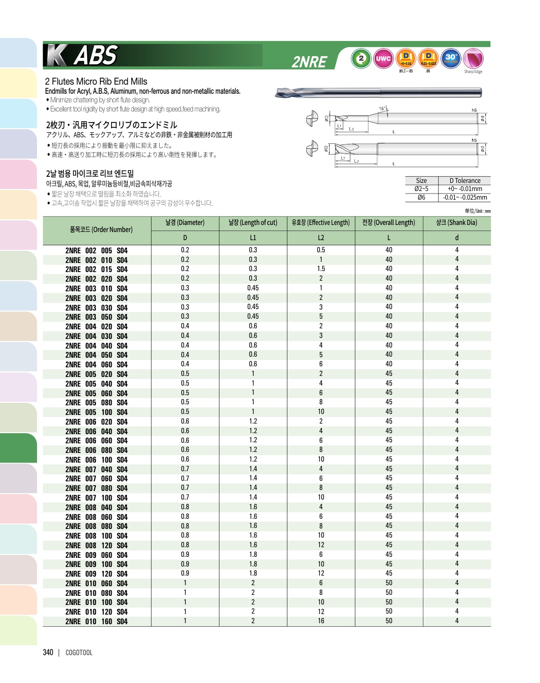 K-ABS는 아크릴, ABS, 목업, 알루미늄 등 비철, 비금속 피삭재 전용 엔드밀입니다.