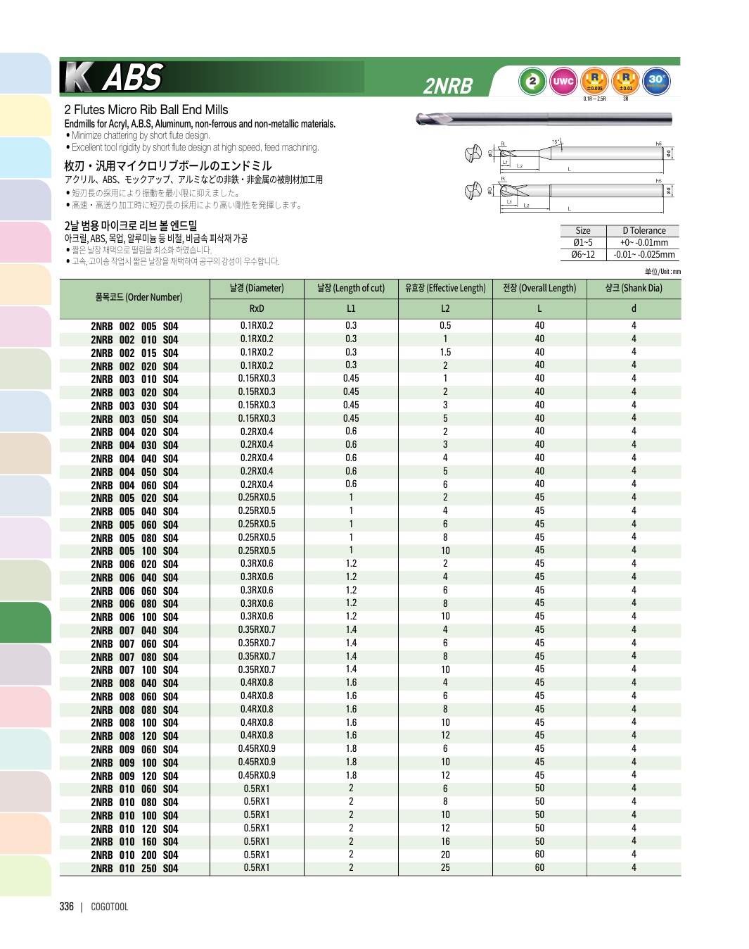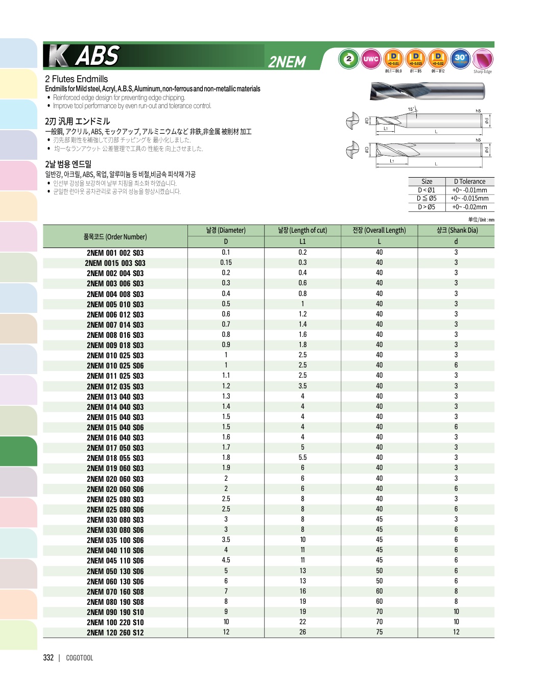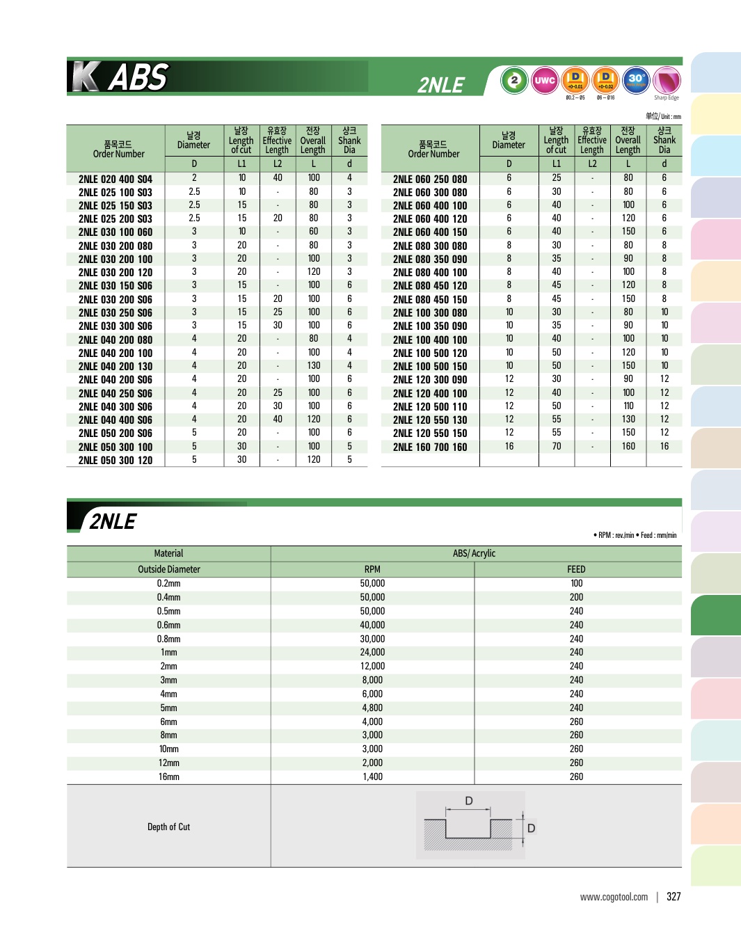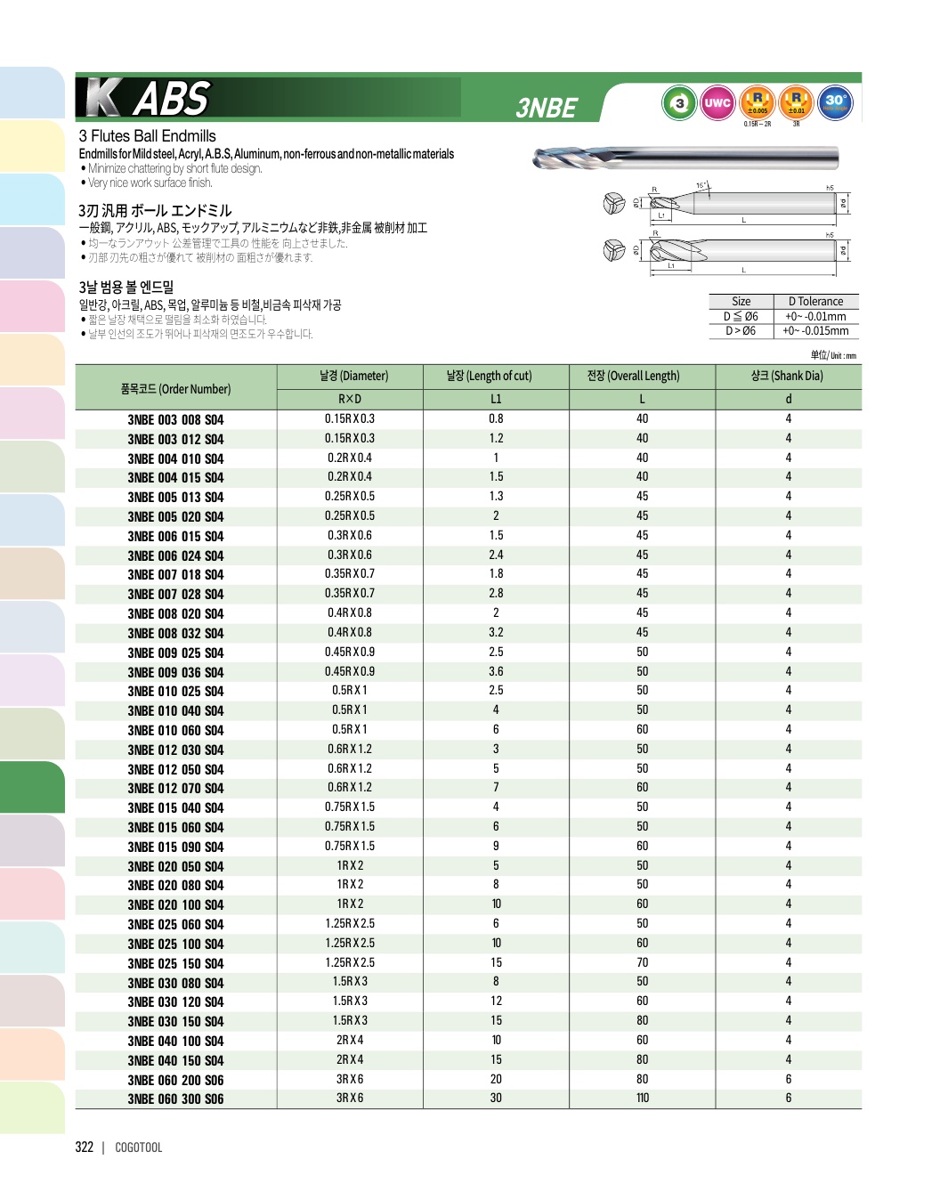 K-ABS는 아크릴, ABS, 목업, 알루미늄 등 비철, 비금속 피삭재 전용 엔드밀입니다.