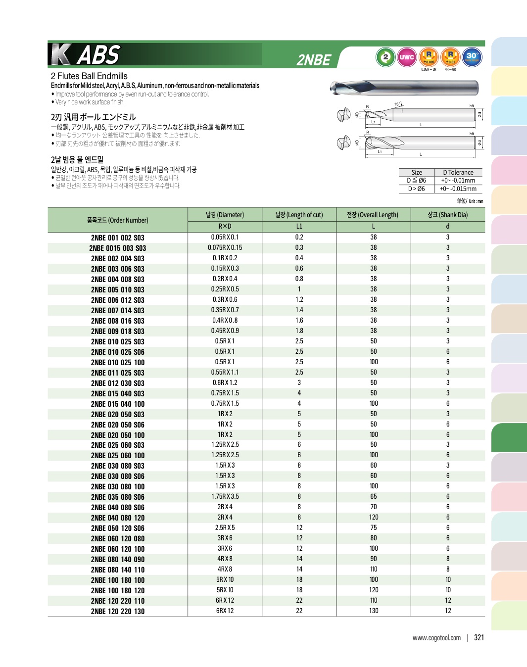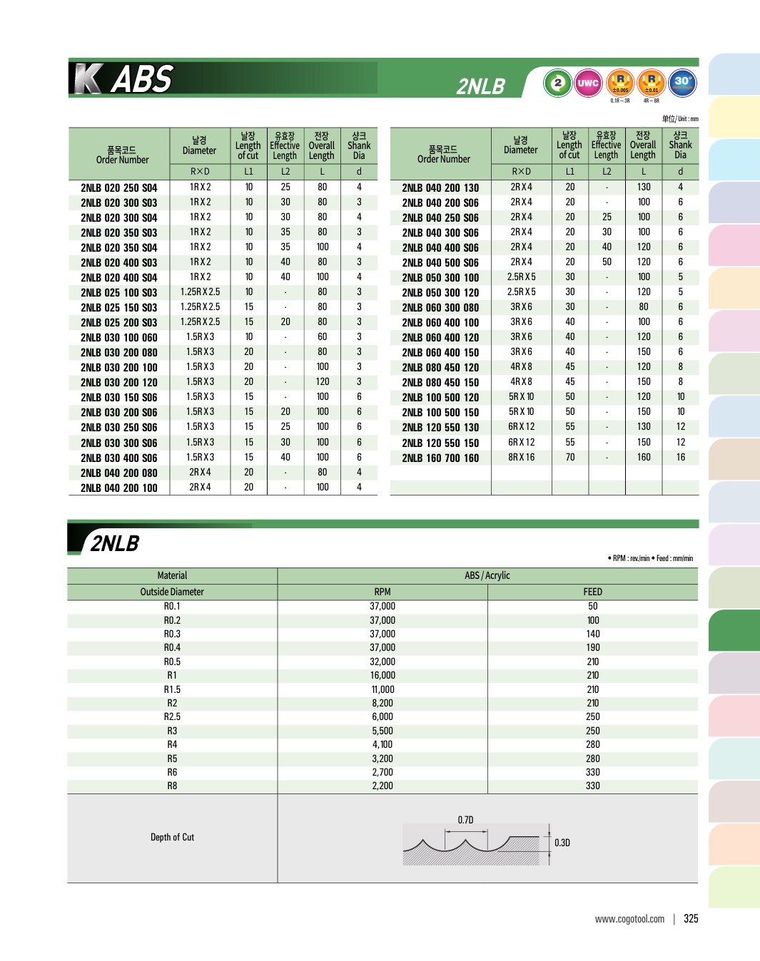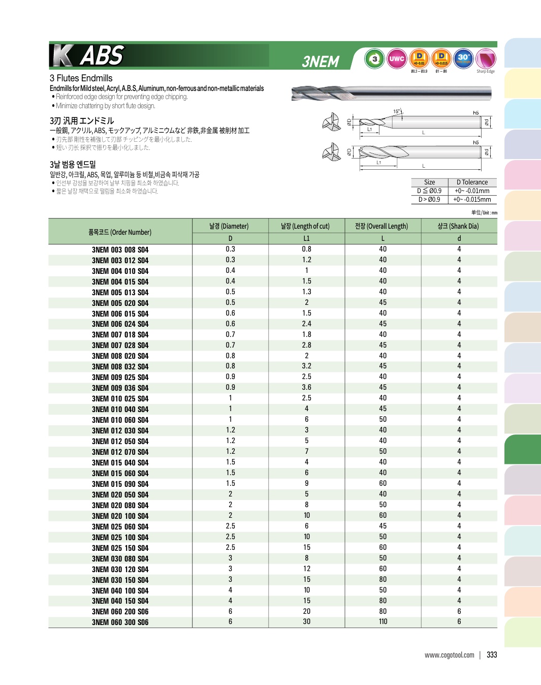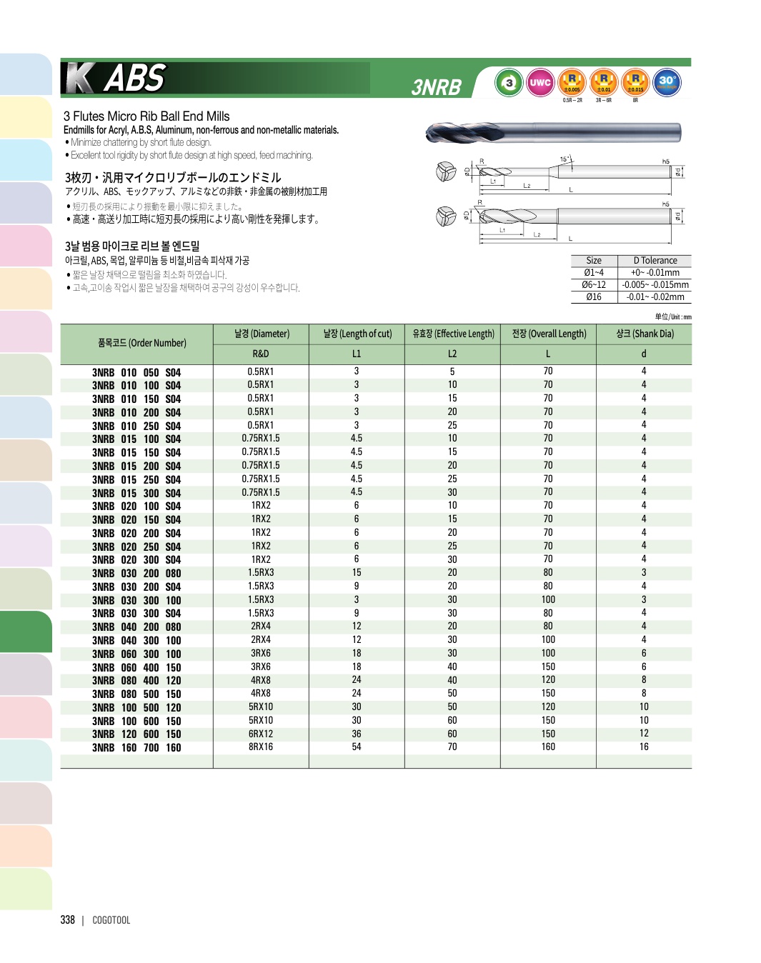 K-ABS는 아크릴, ABS, 목업, 알루미늄 등 비철, 비금속 피삭재 전용 엔드밀입니다.