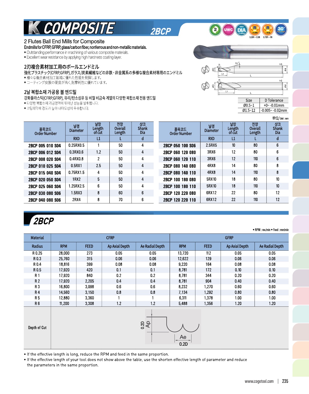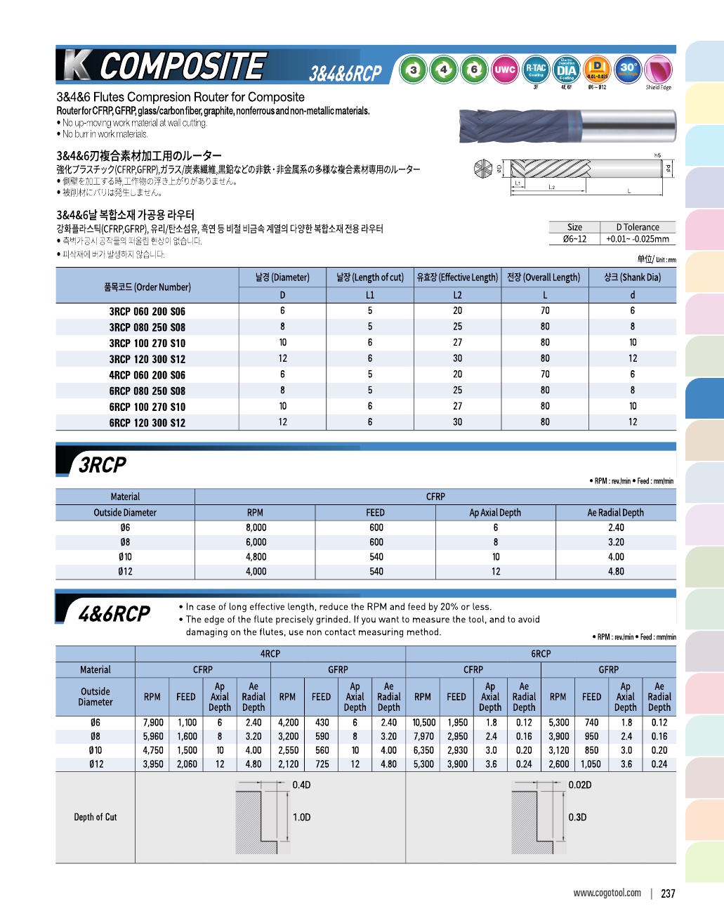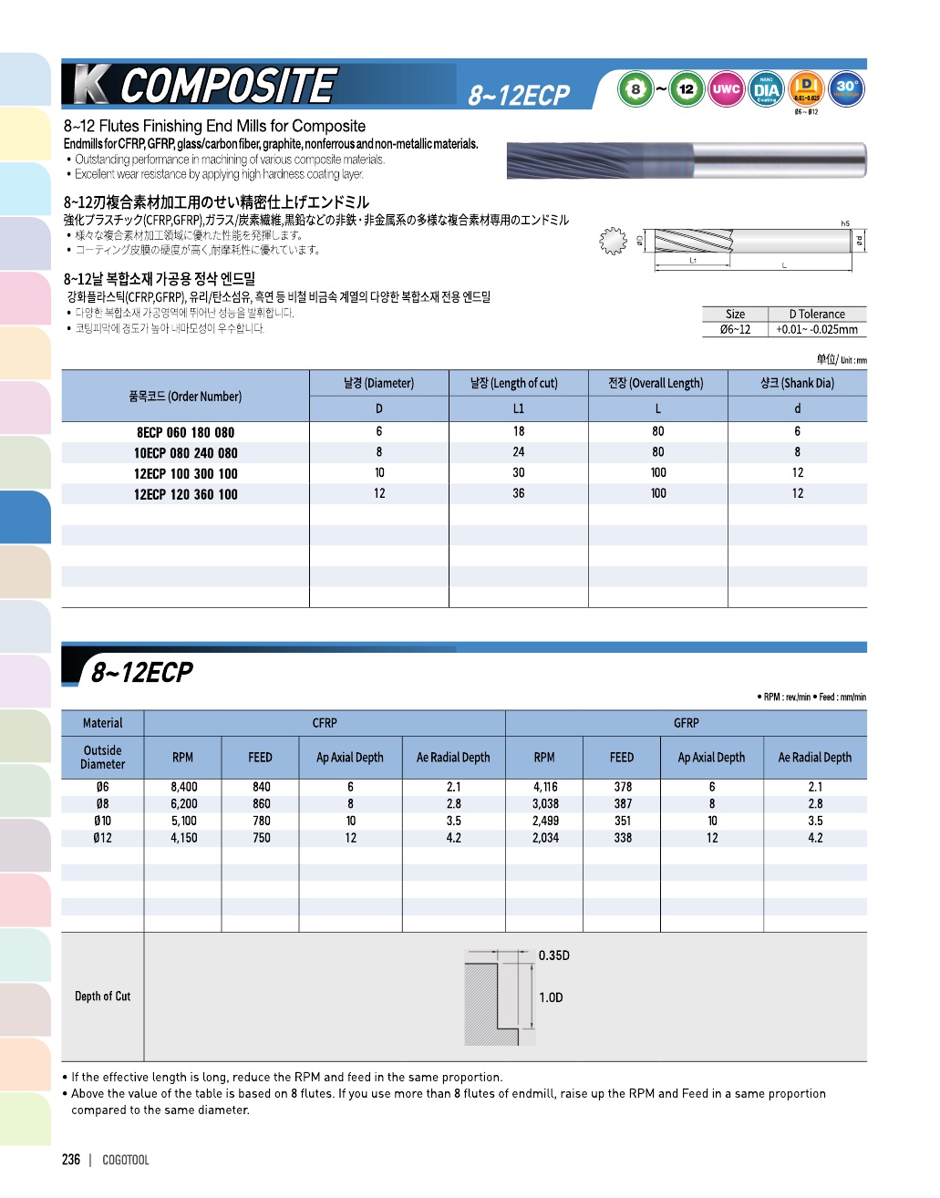 - - 강화플라스틱(CFRP, GFRP), 유리/탄소섬유 등 비철 비금속 계열의 다양한 복합소재 전용 엔드밀