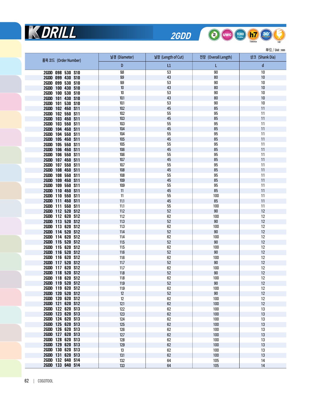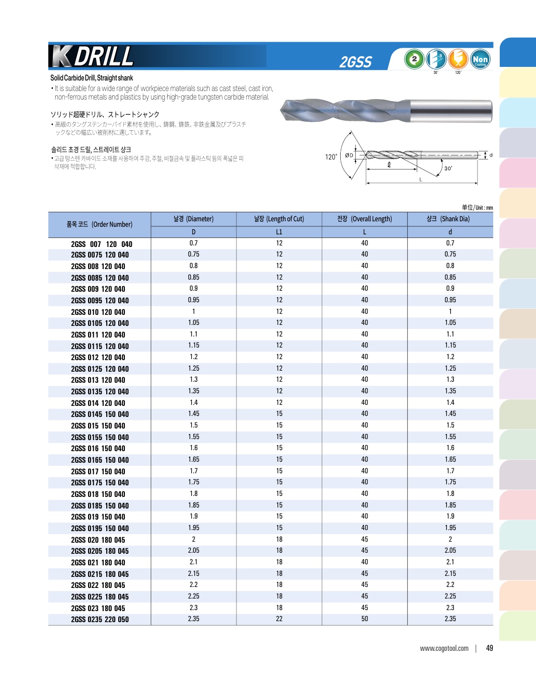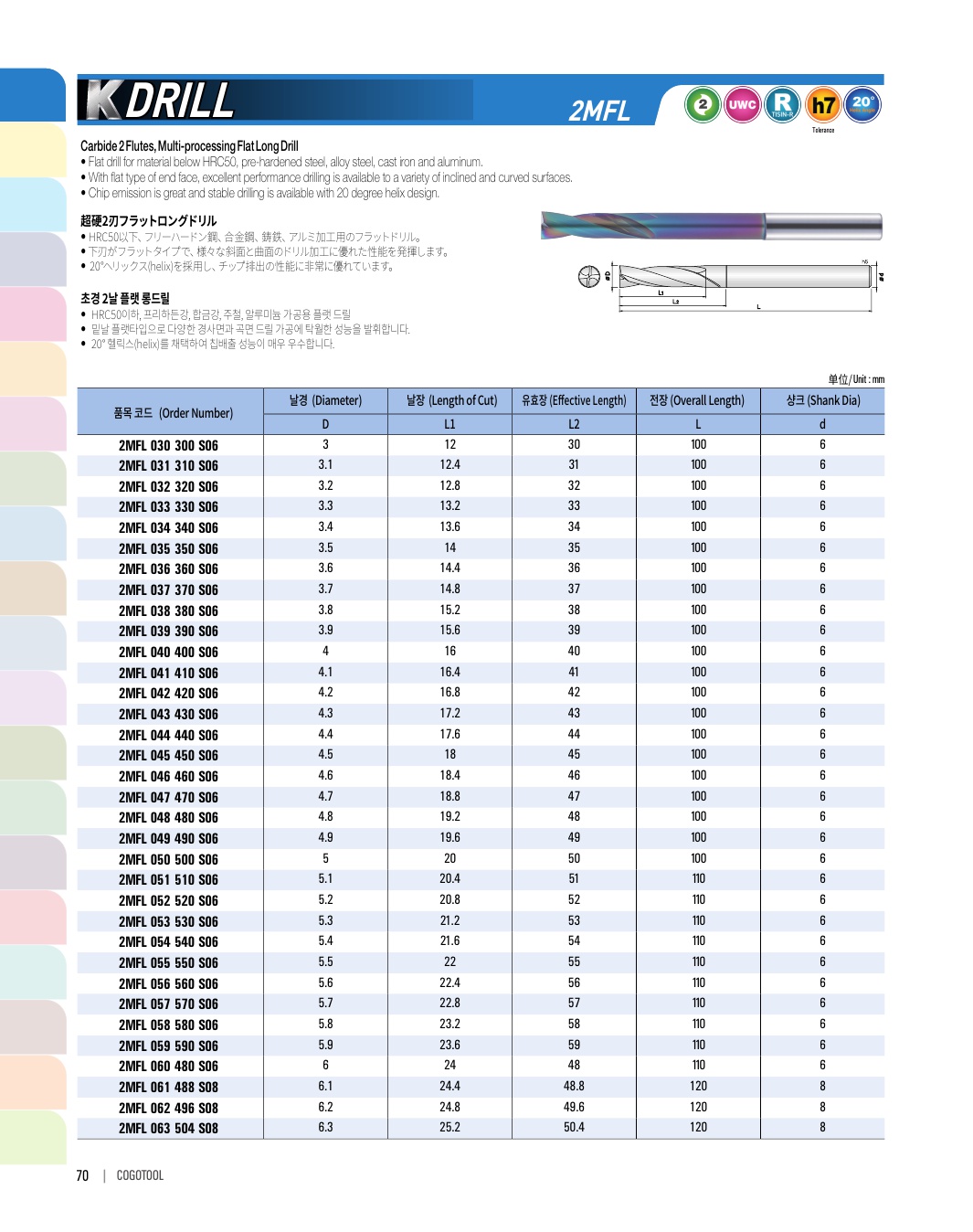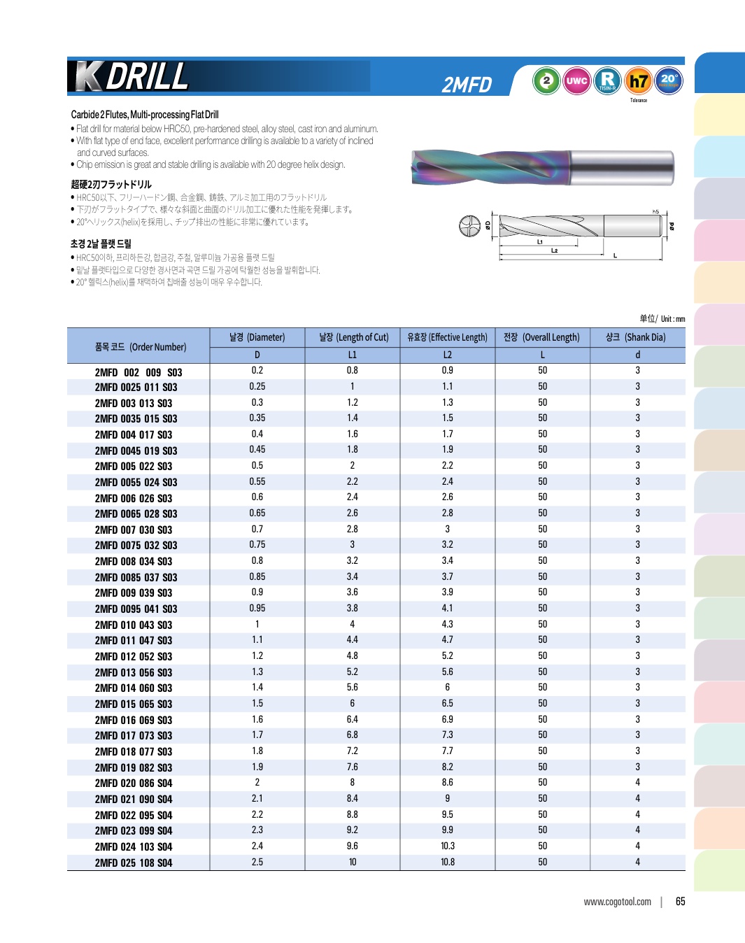 K-DRILL은 S45C, SCM, 주강, 주철 등의 자동차 부품가공에 최적의 성능을 발휘합니다. 타입별로 초경드릴, 초경 롱 드릴, 초경 플랫 드릴, 초경 플랫 롱드릴 타입이 있습니다