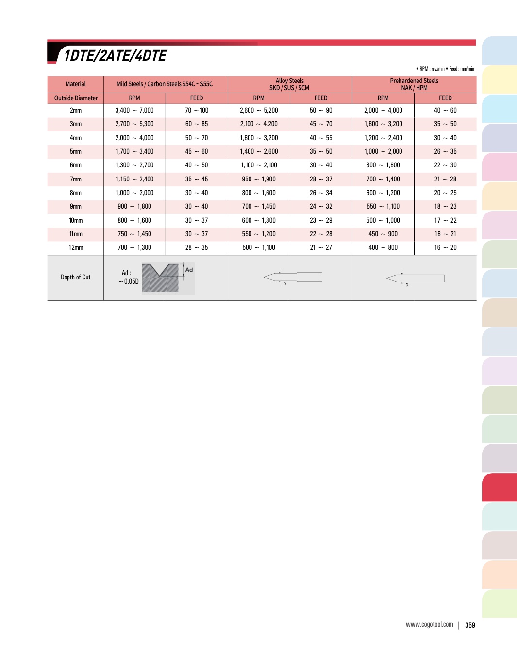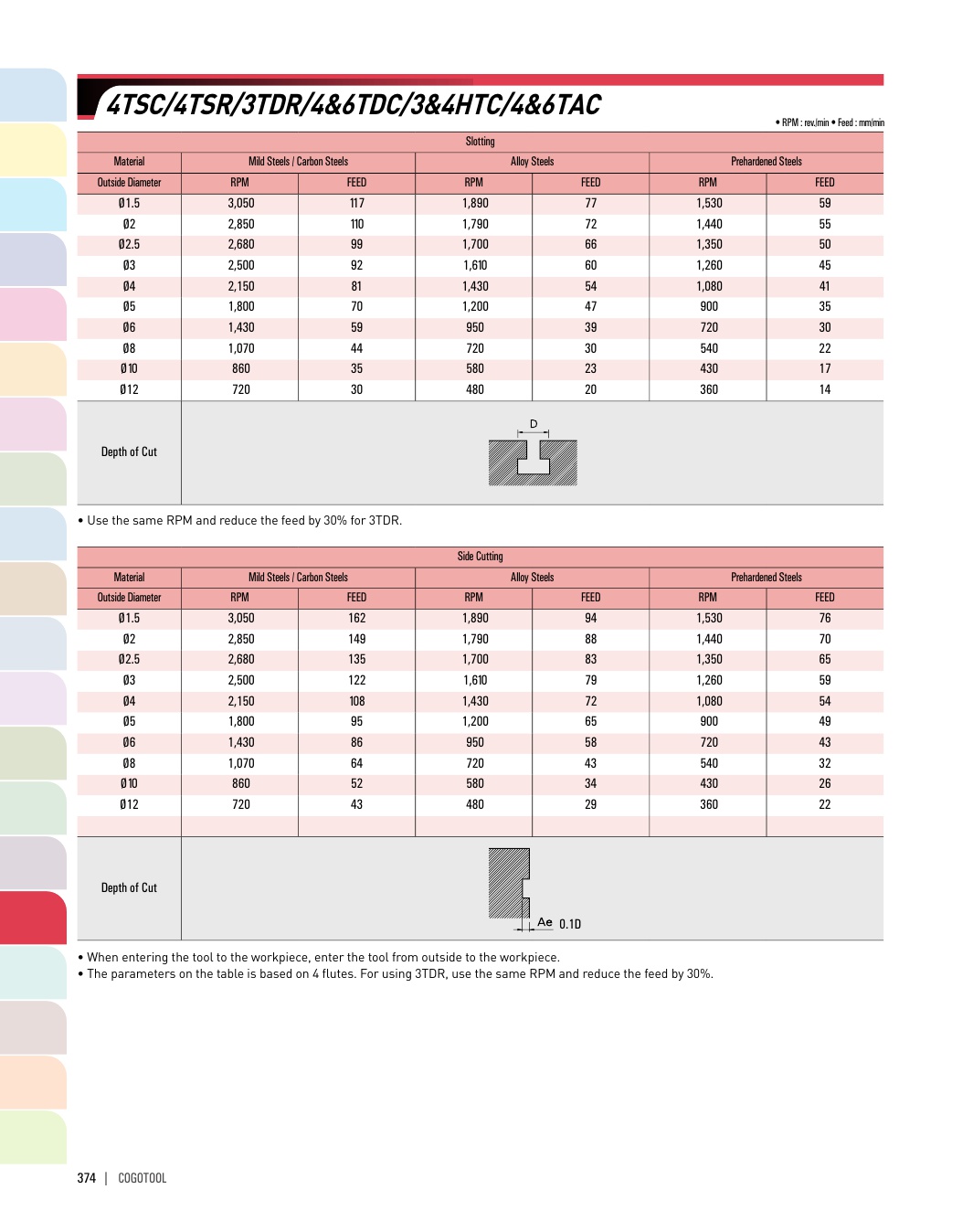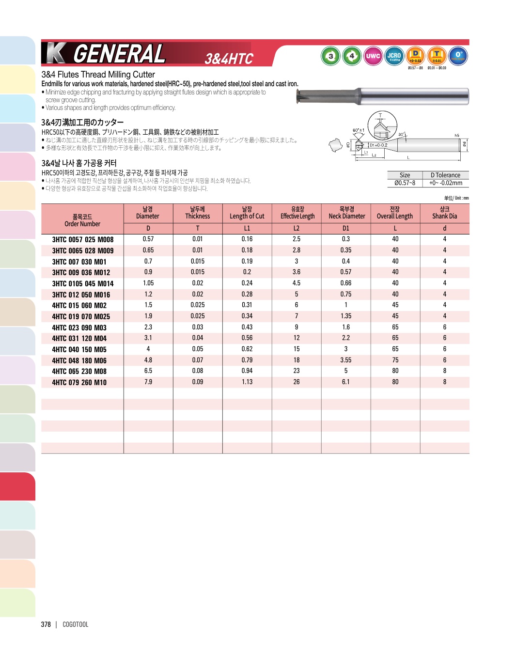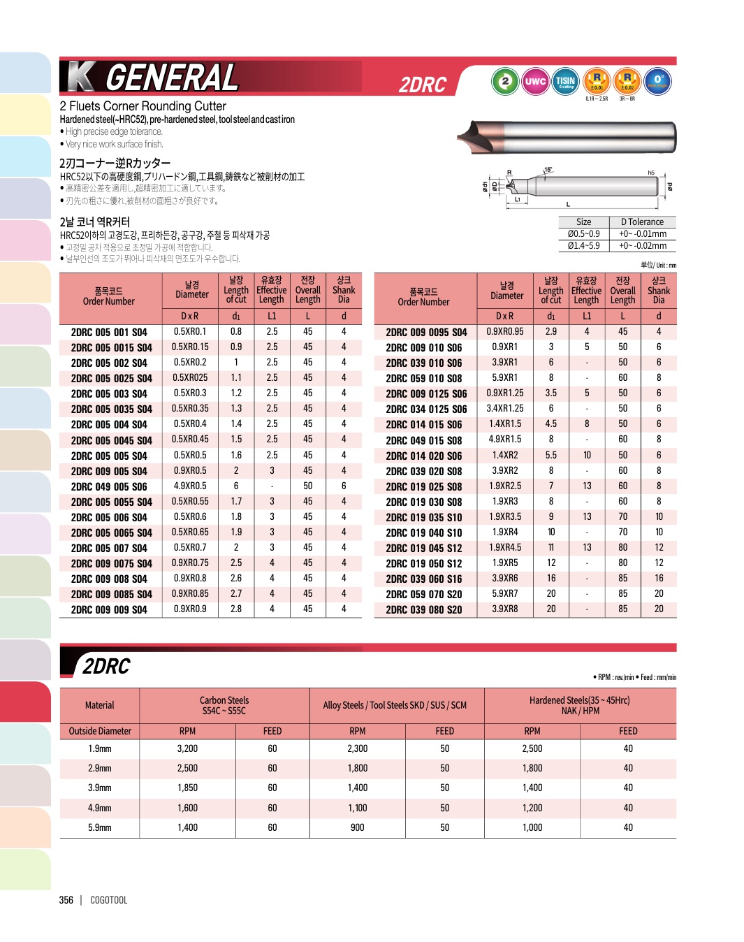 - - 코팅과 비코팅으로 구분하여 HRC50이하의 고경도강, 프리하든강, 주철 등 다양한 피삭재 가공이 가능합니다.
