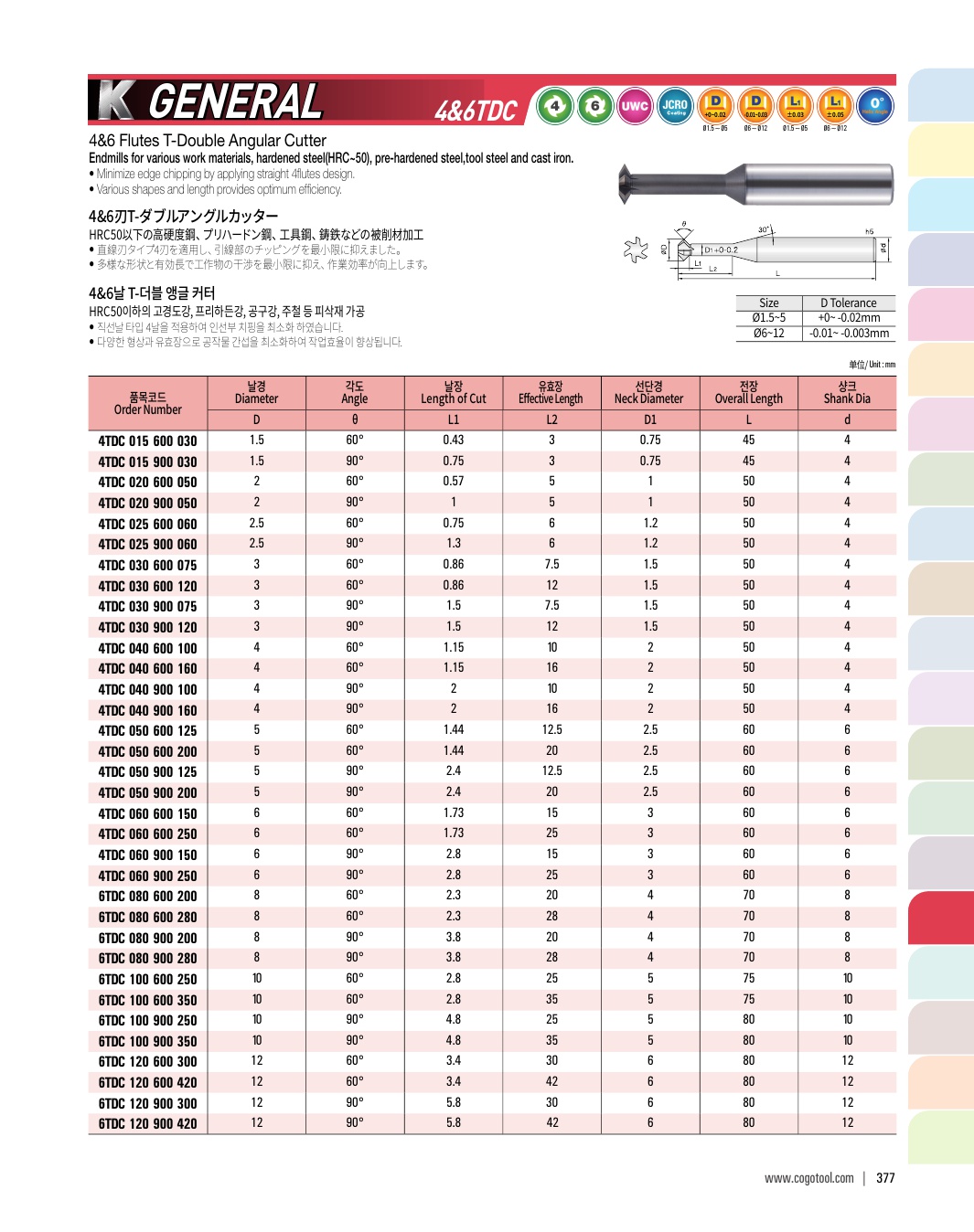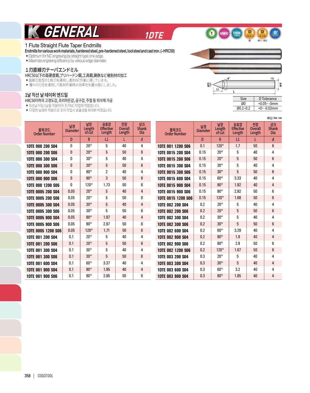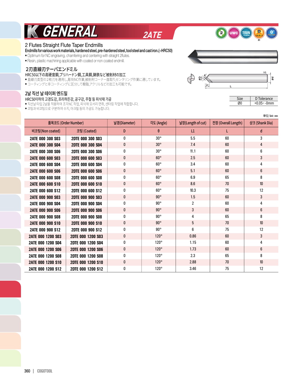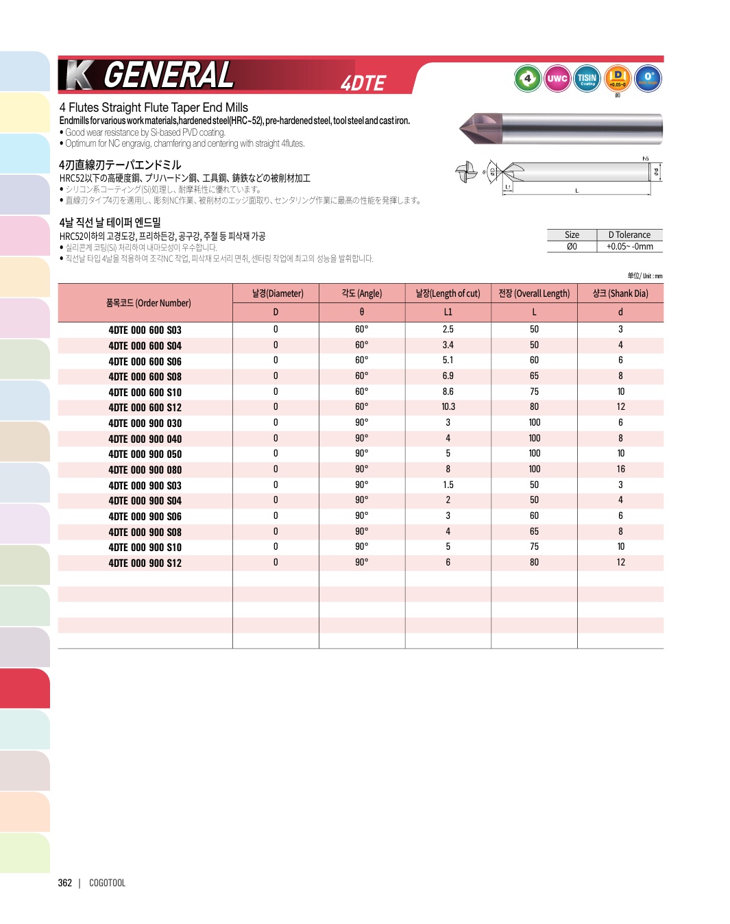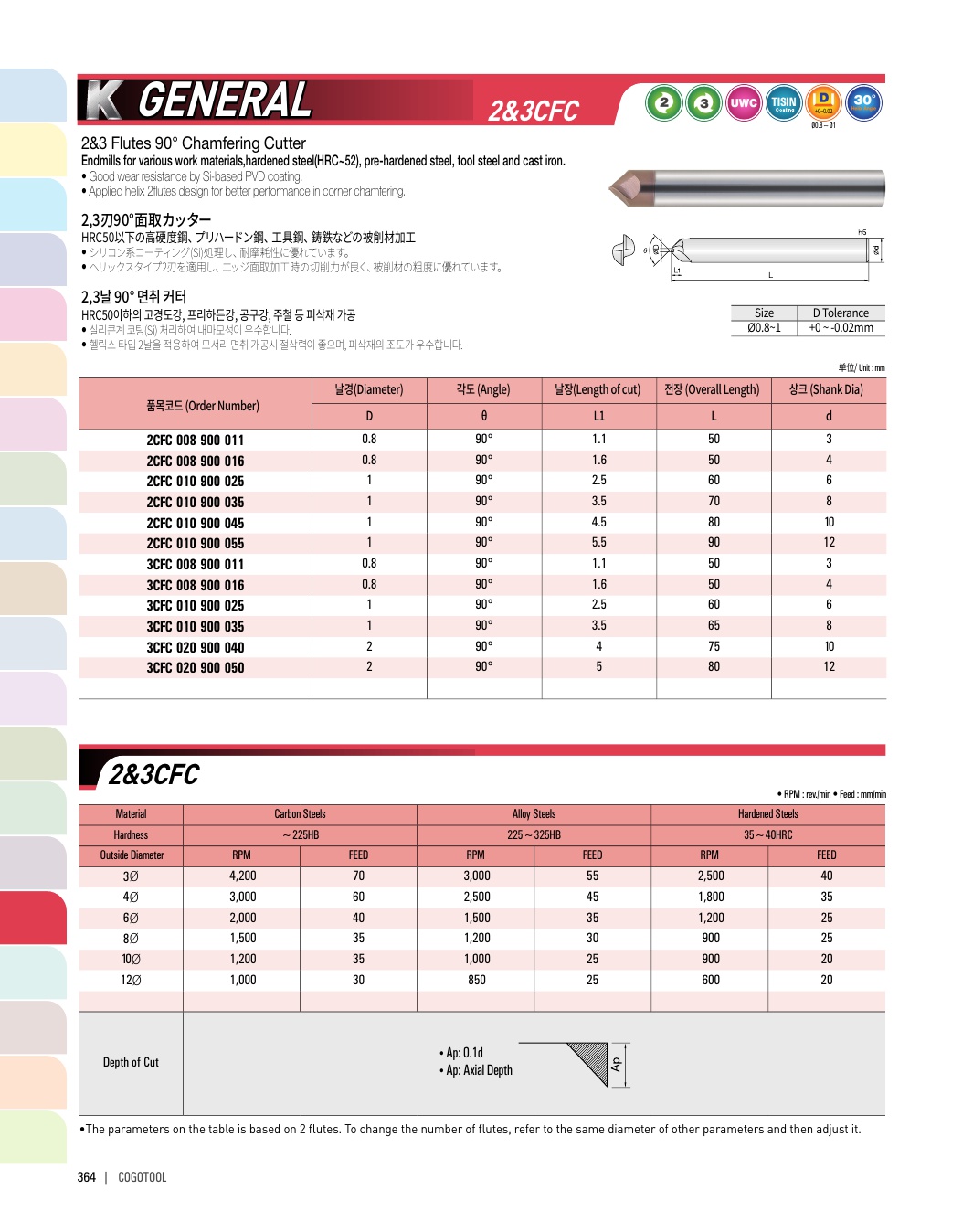 - - 직선날 타입 4날을 적용하여 조각NC 작업, 피삭재 모서리 면취, 센터링 작업에 최고의 성능을 발휘합니다.