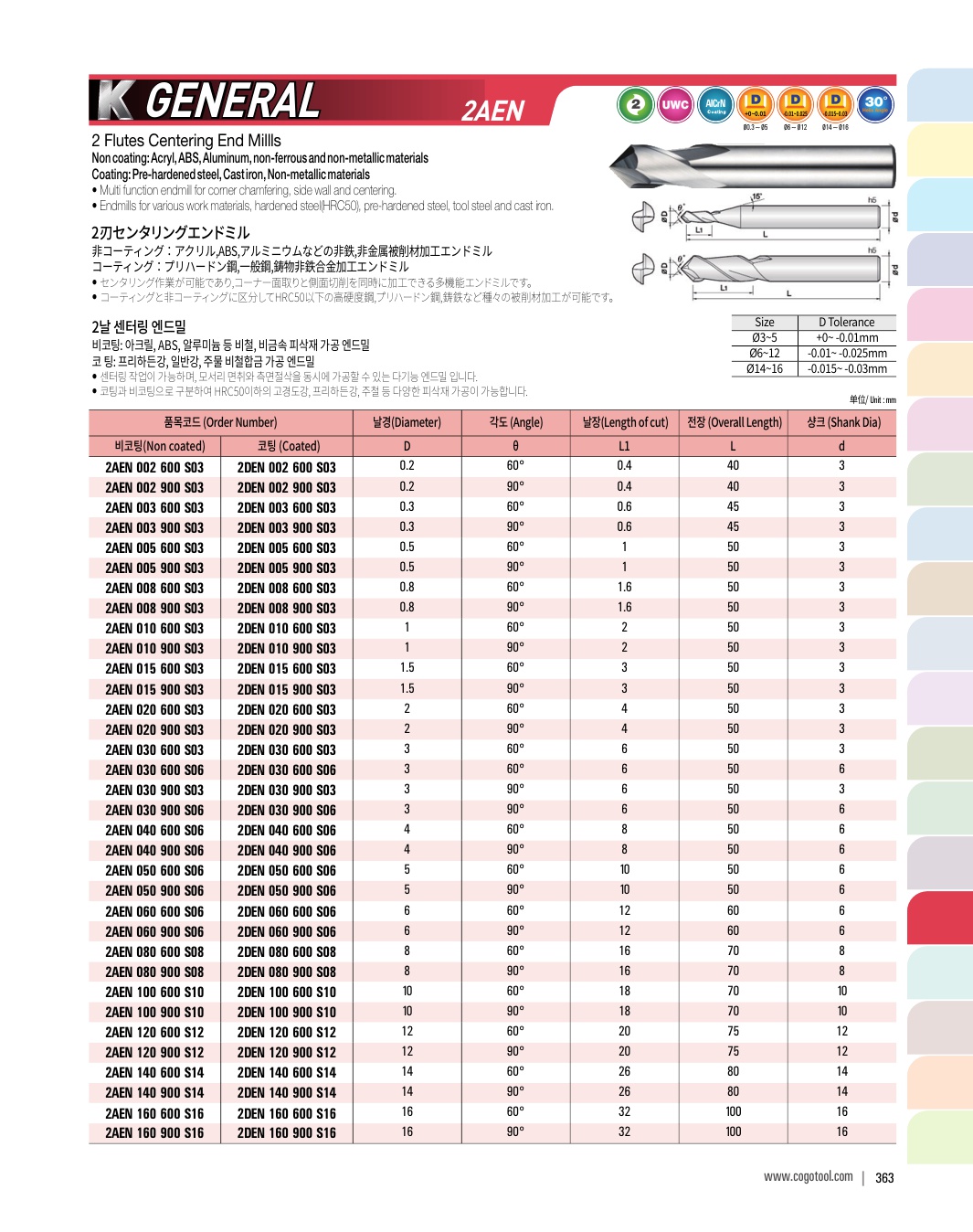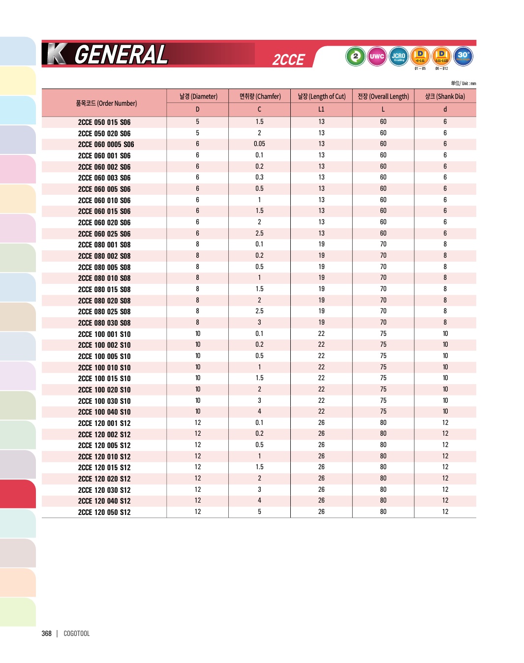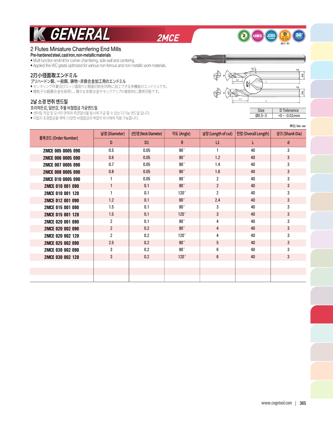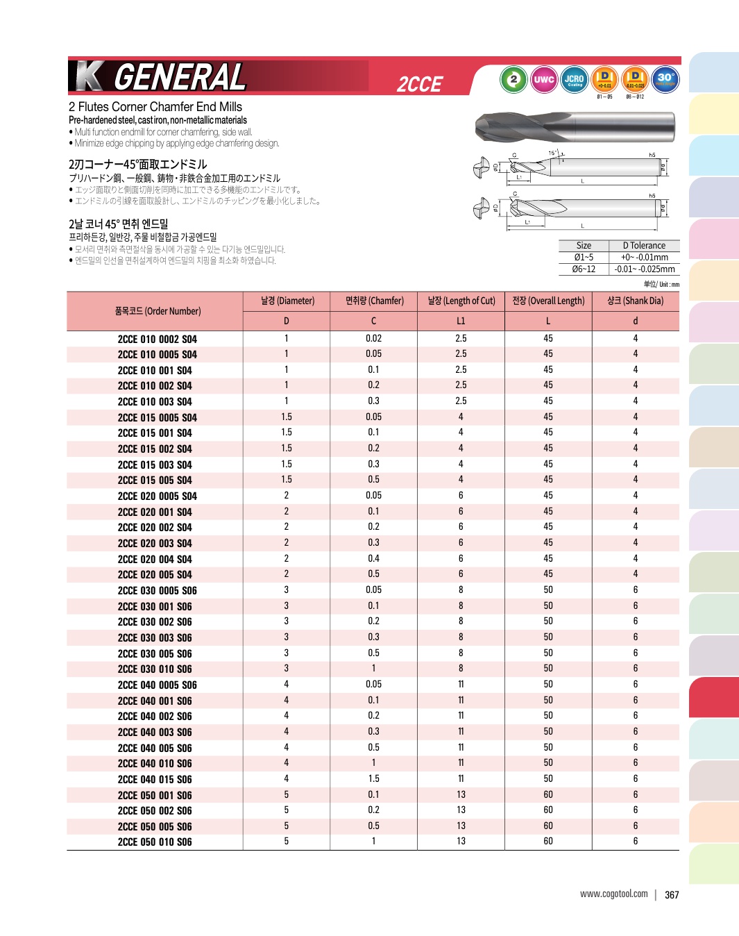 - - 헬릭스 타입 2날을 적용하여 모서리 면취 가공시 절삭력이 좋으며, 피삭재의 조도가 우수합니다.