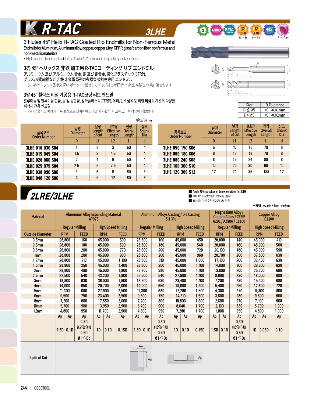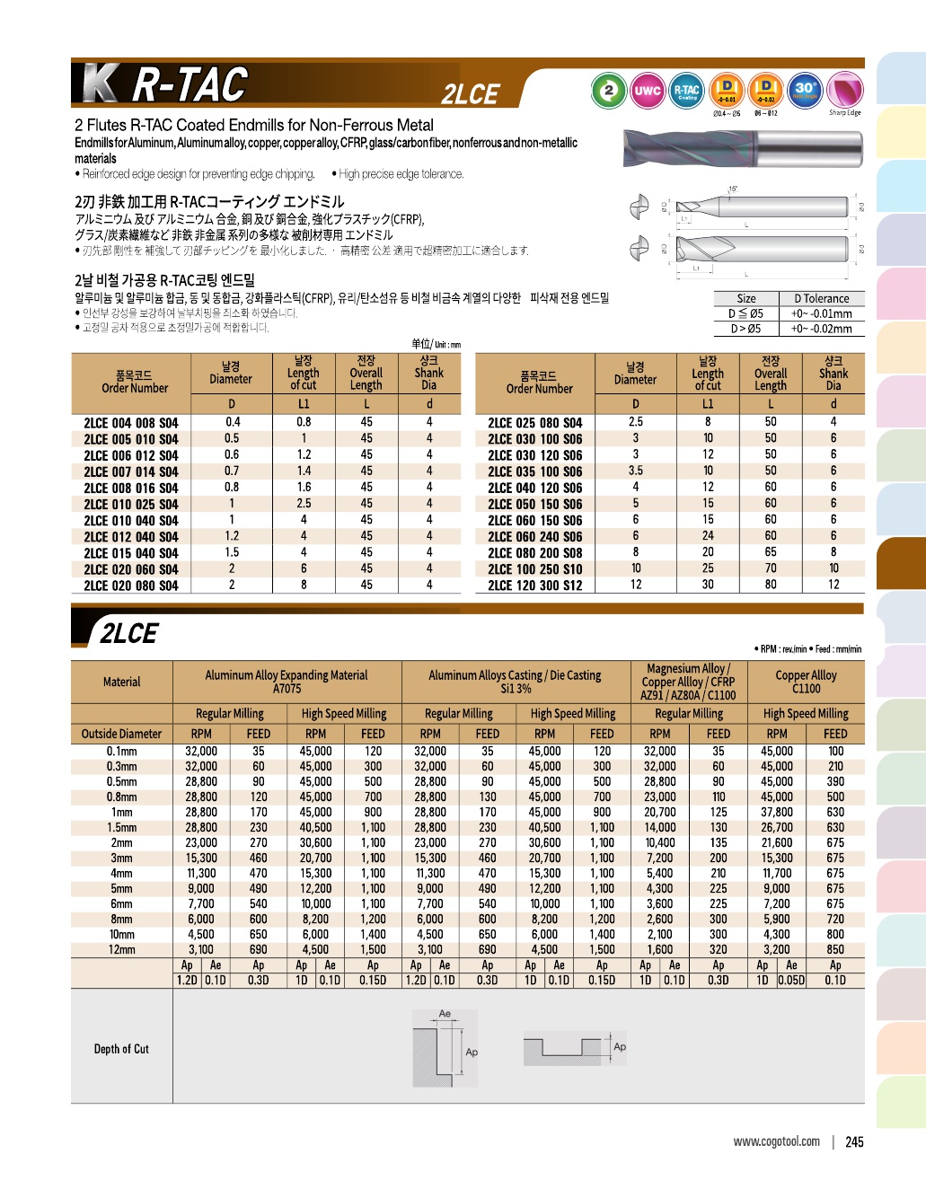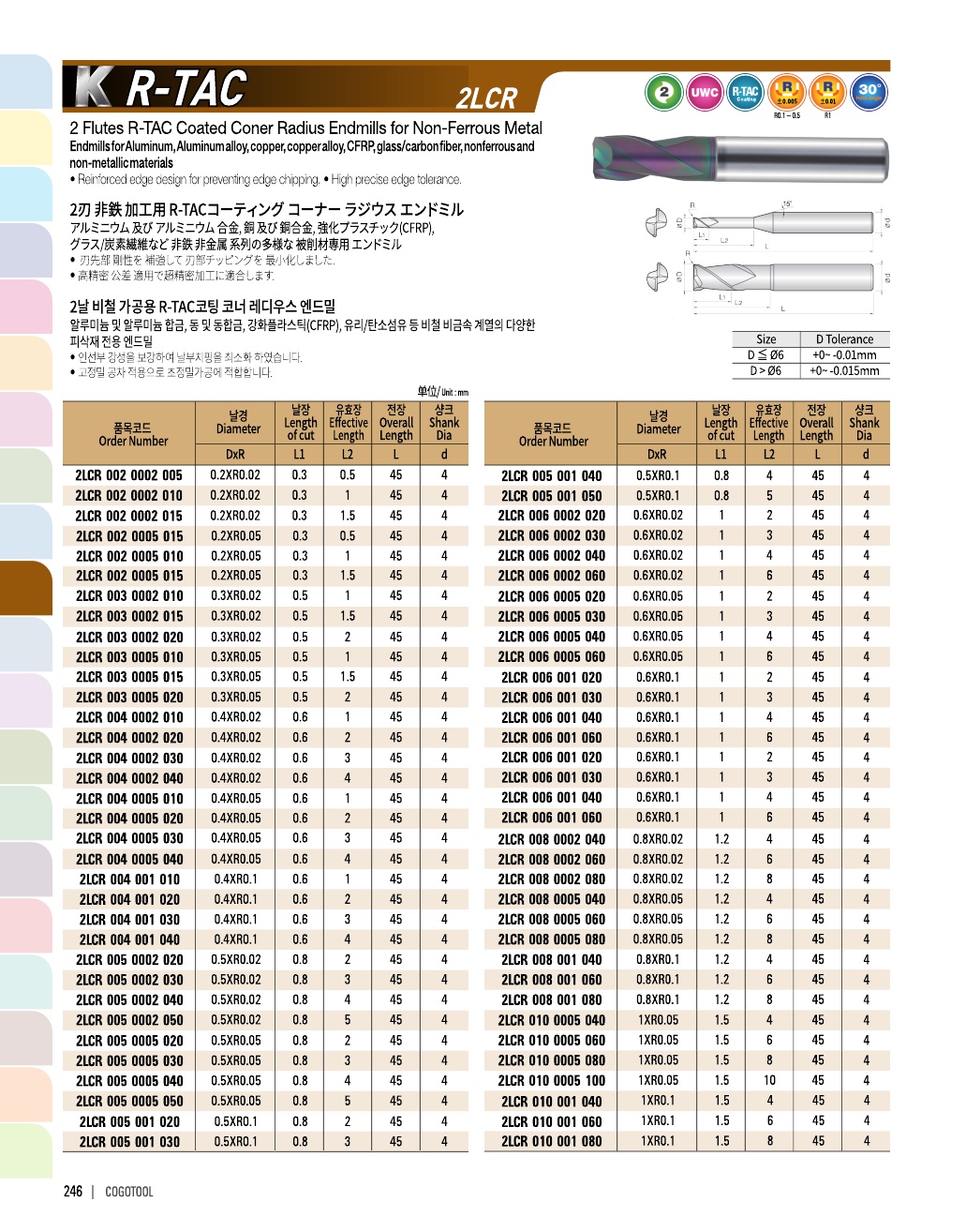 K R-TAC은 알루미늄과 동, 플라스틱 등에 가장 가공성이 좋은 신개념의 코팅을 적용한 엔드밀입니다.