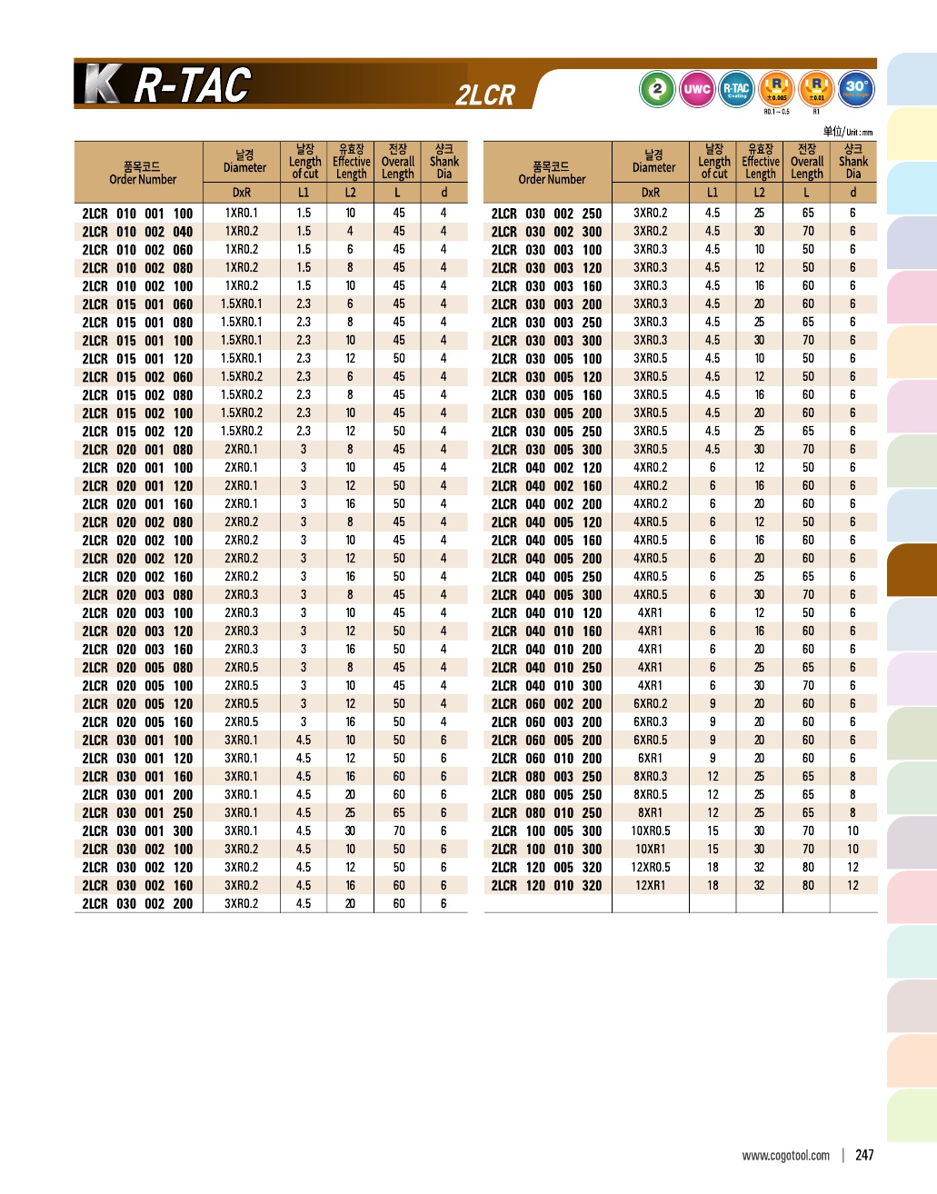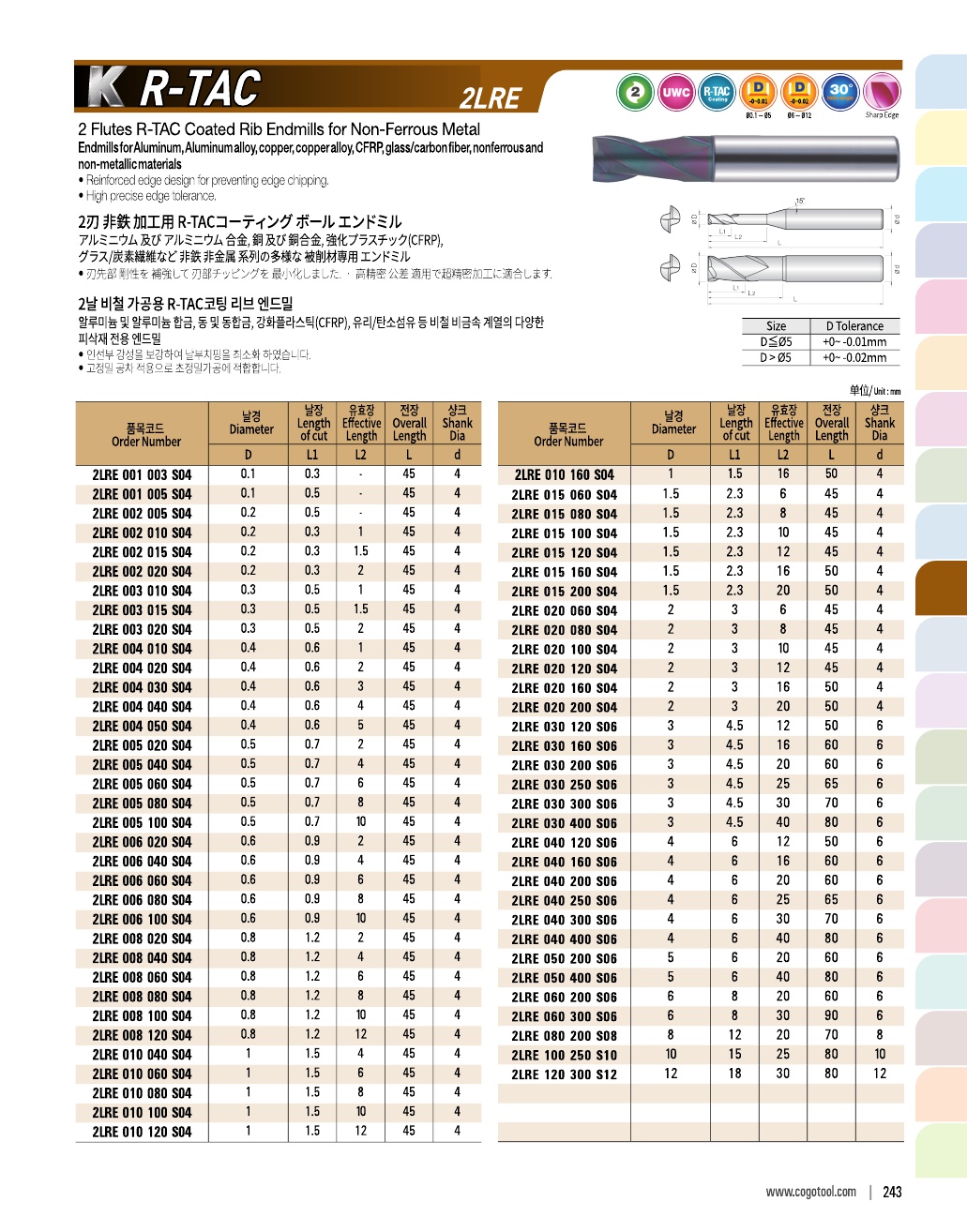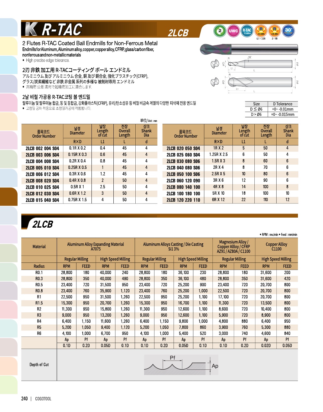 K R-TAC은 알루미늄과 동, 플라스틱 등에 가장 가공성이 좋은 신개념의 코팅을 적용한 엔드밀입니다.