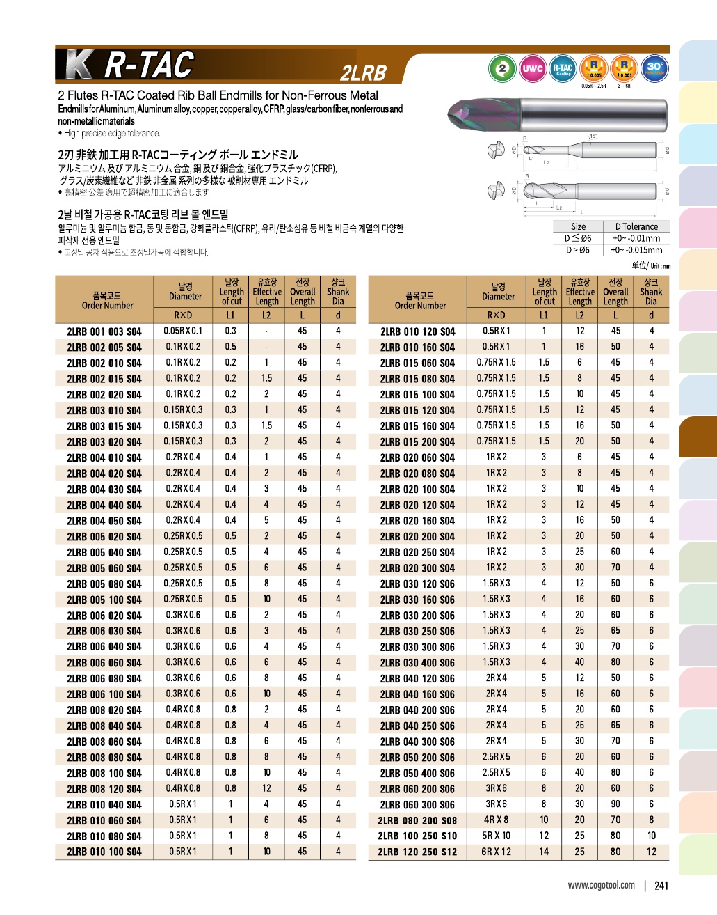 2날 비철 가공용 R-TAC 코팅 볼 엔드밀